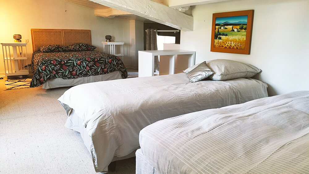 Situées à l’étage, les 2 chambres possèdent chacune 2 lits (1 lit double 140×190 et 1 lit simple 90×190). Elles donnent toutes les 2 sur le parc arboré de la propriété. Possibilité de rajouter un lit parapluie bébé sur demande.